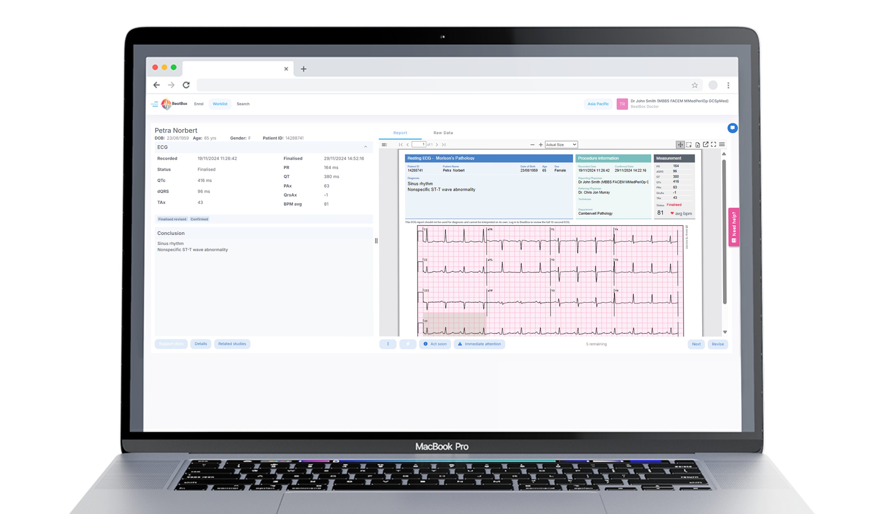 The majority of tests are reimbursed under Medicare, with all reports signed off by a specialist and easily accessible via the BeatBox reporting platform.